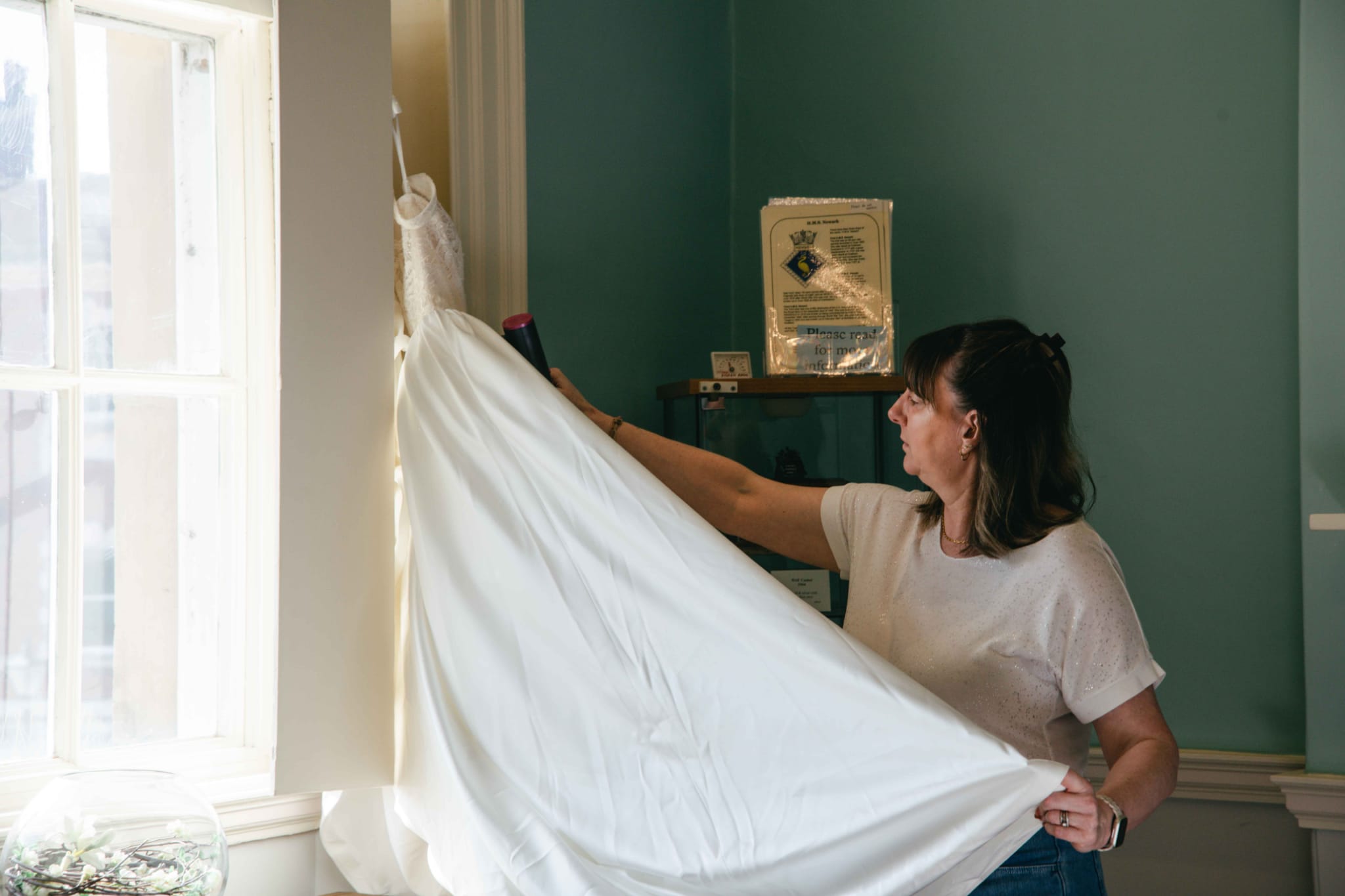 Because of this, you’ll often try dresses on without much support, especially around the bust — this allows us to shape the dress correctly to you.